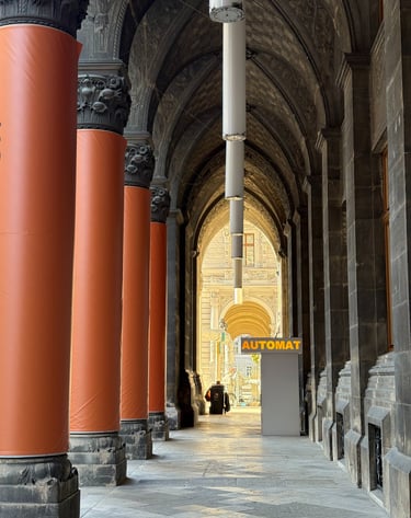 I’m under an arcade in the center of Vienna, with the city’s typical classical, historic style. The ceiling has a perfect checkerboard pattern, and on the left, large columns support everything, giving a sense of solidity and the orderly feel typical of Vienna.