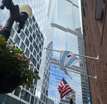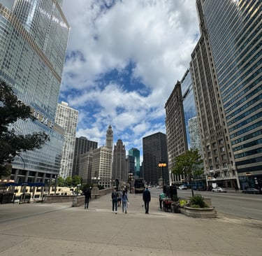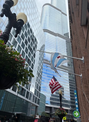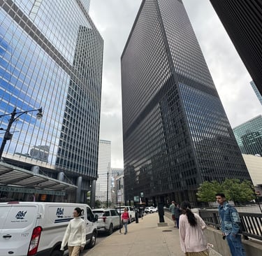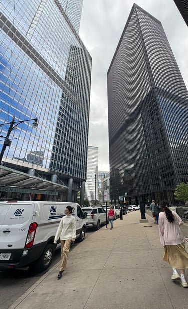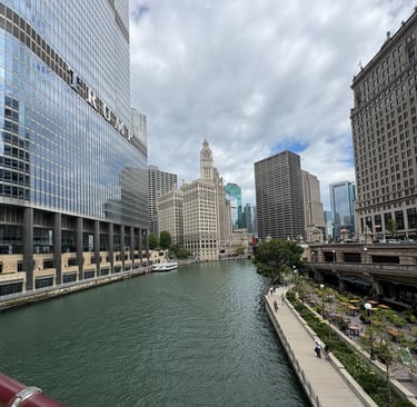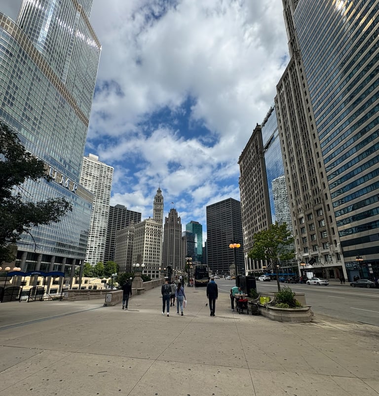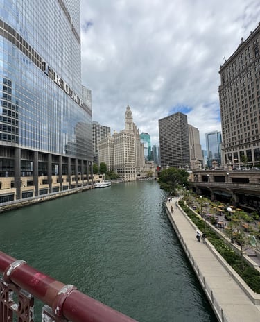I’m on a bridge in Downtown Chicago, with the river flowing beneath me and the Trump Tower standing right ahead. The water reflects the surrounding skyscrapers, creating a contrast between the fluidity of the river and the rigidity of the steel and glass buildings.