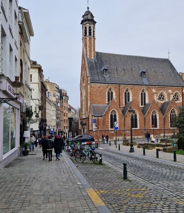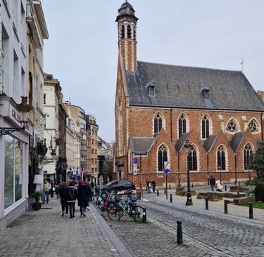 In a little square in Brussels, standing in front of a typical Brussels church with its characteristic architecture, perfectly blending with the historic city vibe.