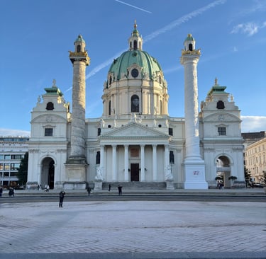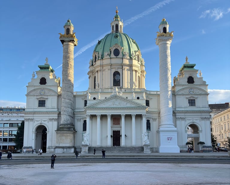 Even from a distance, it gave me a sense of grandeur. The Karlskirche is one of Vienna's most famous churches, built in the early 1700s and dedicated to St. Charles Borromeo. The green dome and two columns on either side make it unmistakable, a landmark of the city.