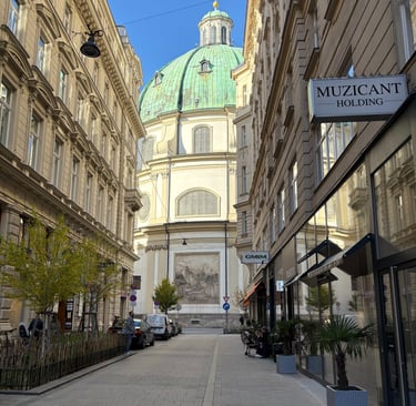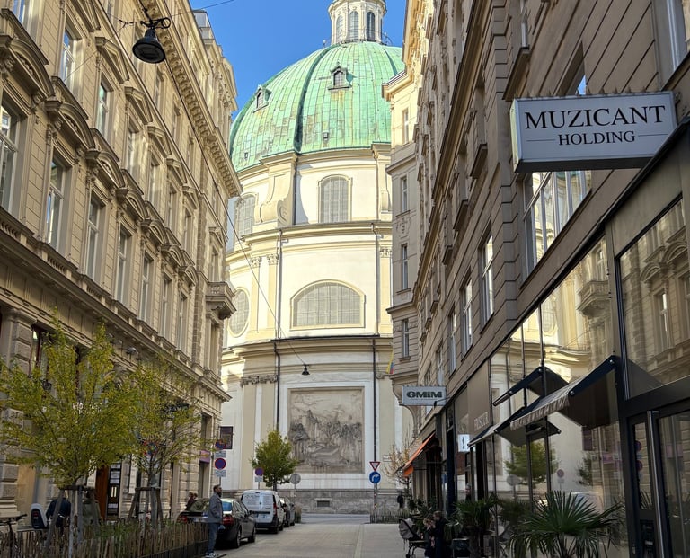 Vienna, historic center. Between two elegant buildings, the green dome of the Peterskirche stands out: imposing, clean, and perfectly proportioned.