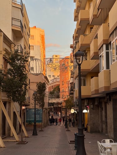 We are at the beginning of a street in the center of Almería, surrounded by buildings and houses in warm colors, typical of the local architecture. The scene creates a welcoming and bright atmosphere, representative of the city.
