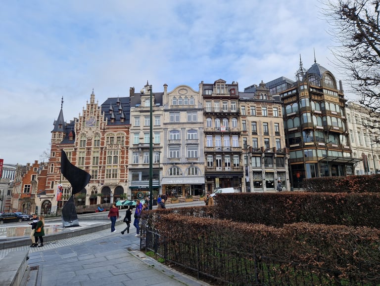 Colorful row houses in central Brussels, with typical Brussels-style roofs, perfectly fitting the lively city vibe.