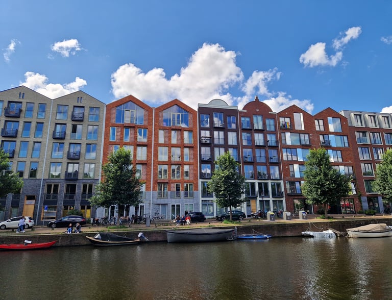 Rows of typical Amsterdam houses, narrow and colorful, facing the canal. The tall, leaning facades reflect in the water.