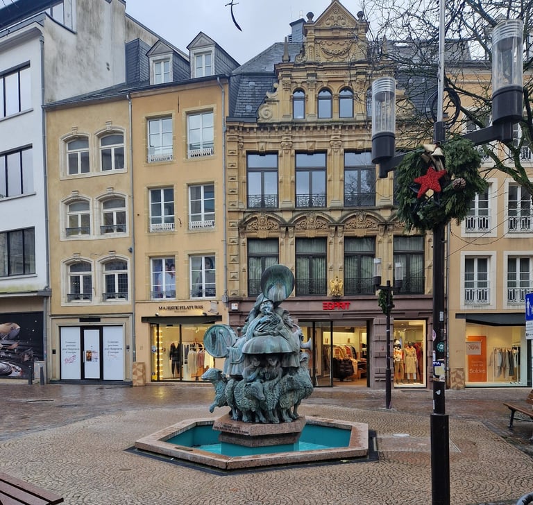 Square in the center of Luxembourg, featuring historic buildings with elegant facades and modern shops on the ground floor. In the middle stands a small bronze fountain, surrounded by cobblestones and benches, adding a distinctive touch to the street’s calm atmosphere.