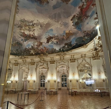 I’m standing in front of the interior frescoes of Schloss Schönbrunn in Vienna. The walls and ceilings are richly decorated, with detailed ornaments and vibrant colors that showcase the artistic mastery of the era. Every detail draws the eye and tells the story of the palace.