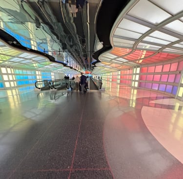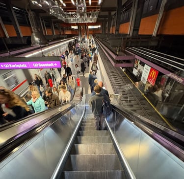 I'm on the escalators descending the Schottentor metro in Vienna. I love capturing these interior spaces, lines, and lights that create interesting perspectives.