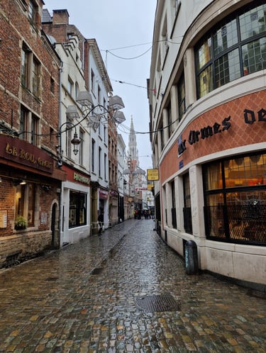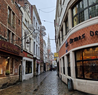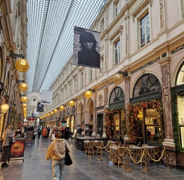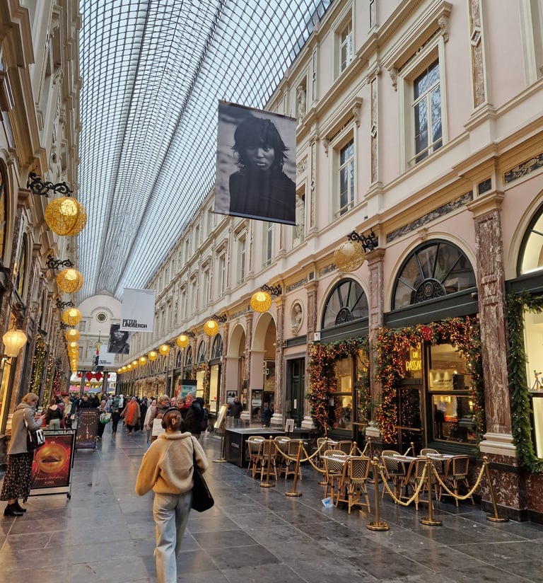 Walking through the Galeries Royales Saint-Hubert in Brussels, surrounded by elegant glass ceilings, ornate details, and stylish shops on both sides.