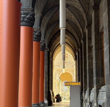 I’m under an arcade in the center of Vienna, with the city’s typical classical, historic style. The ceiling has a perfect checkerboard pattern, and on the left, large columns support everything, giving a sense of solidity and the orderly feel typical of Vienna.