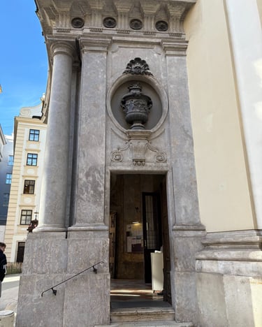 The entrance to the church with the door decorated with typical Viennese ornaments, elegant details that reflect the historical style of the city.