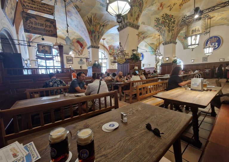 I’m sitting at a wooden table inside Munich’s Hofbräuhaus with a beer stein in front of me. The interior is classic Bavarian: painted ceilings, long benches, and waiters in traditional outfits. The atmosphere is lively, and as I drink, I enjoy the sound of the band playing nearby.